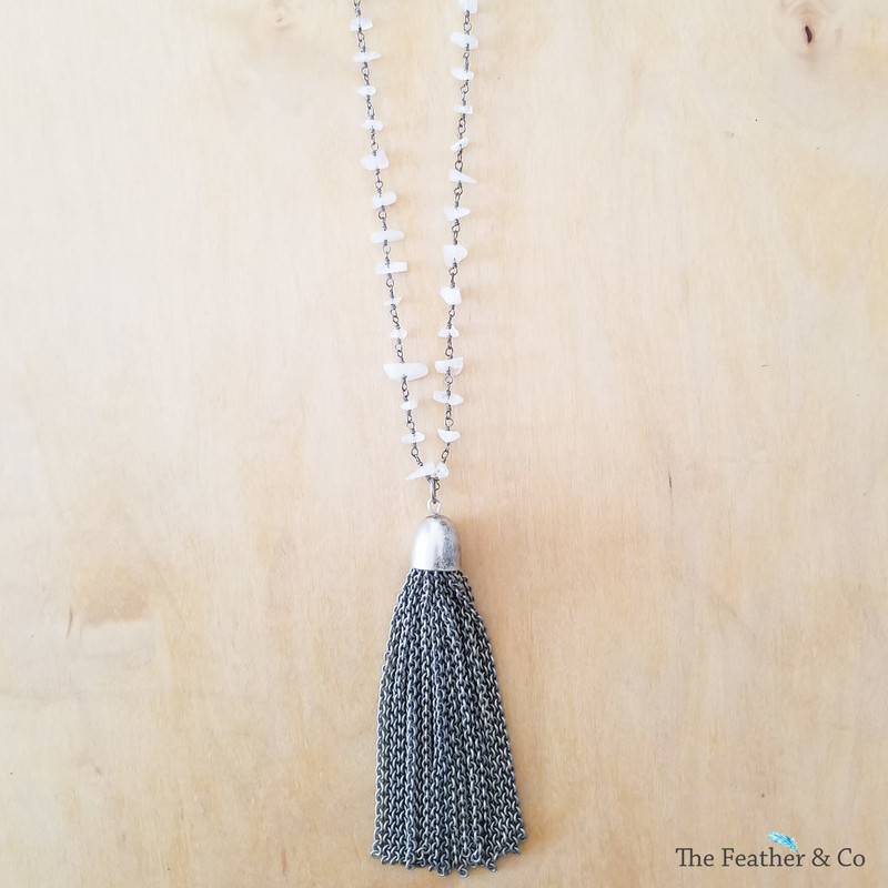 Antique silver, nickel free and tarnish free, fine circle chain mixed with a beautiful linked moonstone chain with chain tassel at the end. (Any length can be requested.)